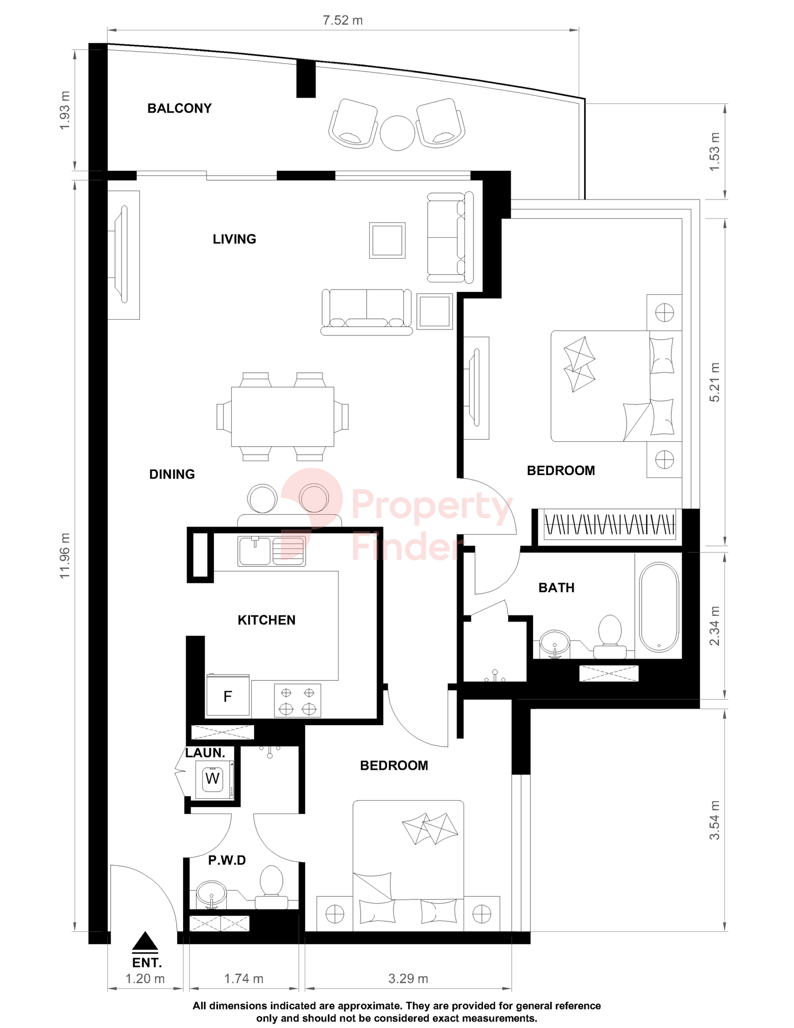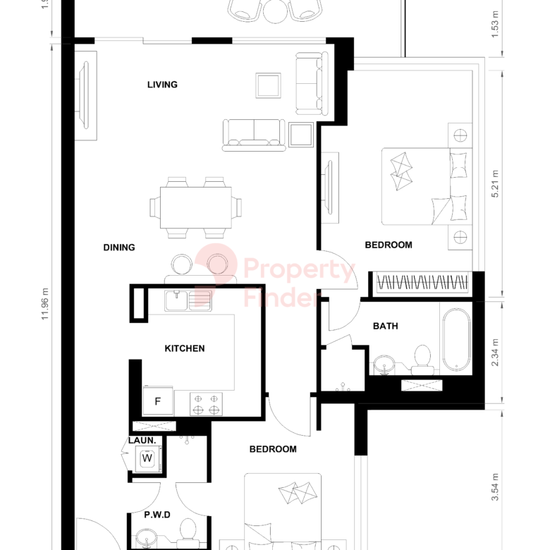 The apartment features a total built-up area of 1,268 sq.ft and includes two bedrooms and two bathrooms. Offered unfurnished, it allows tenants to personalise the space to their own preferences. Built-in wardrobes provide efficient storage, while the private balcony offers open views over greenery and the golf course surroundings.